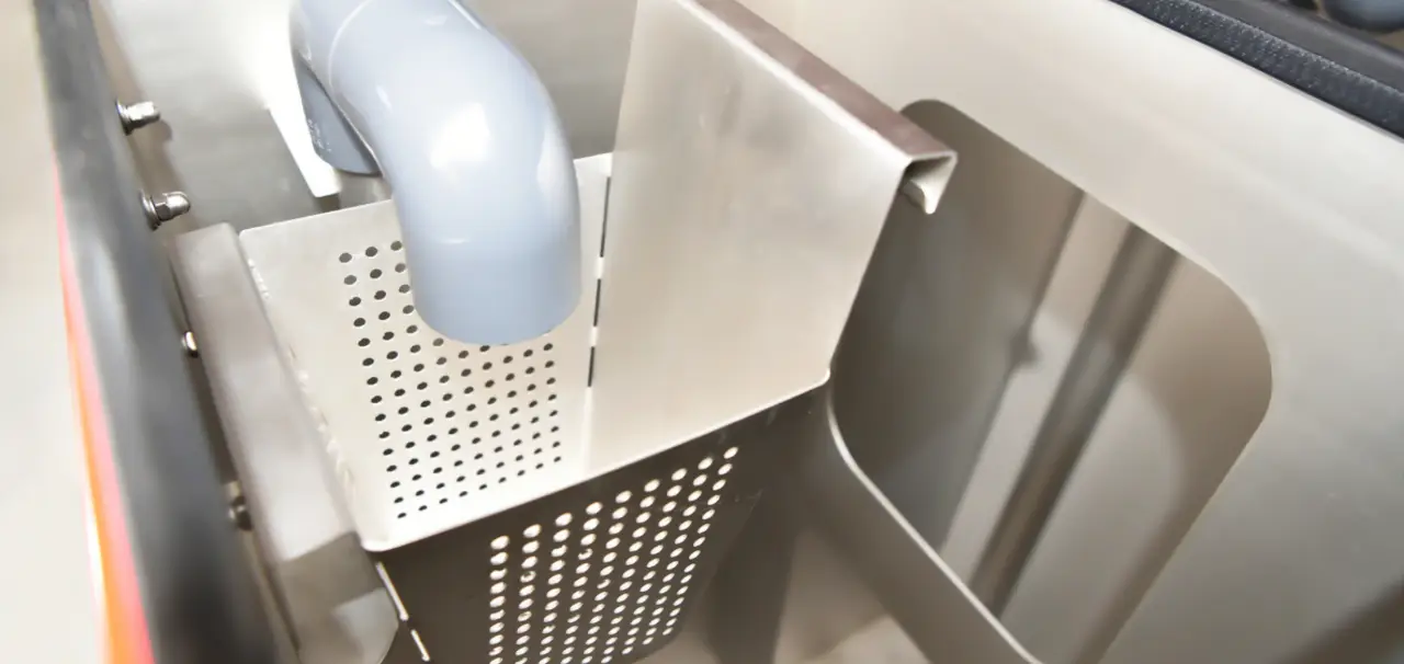 Großer Schmutzfangkorb aus Edelstahl, leicht zugänglich und wartungsfreundlich.
