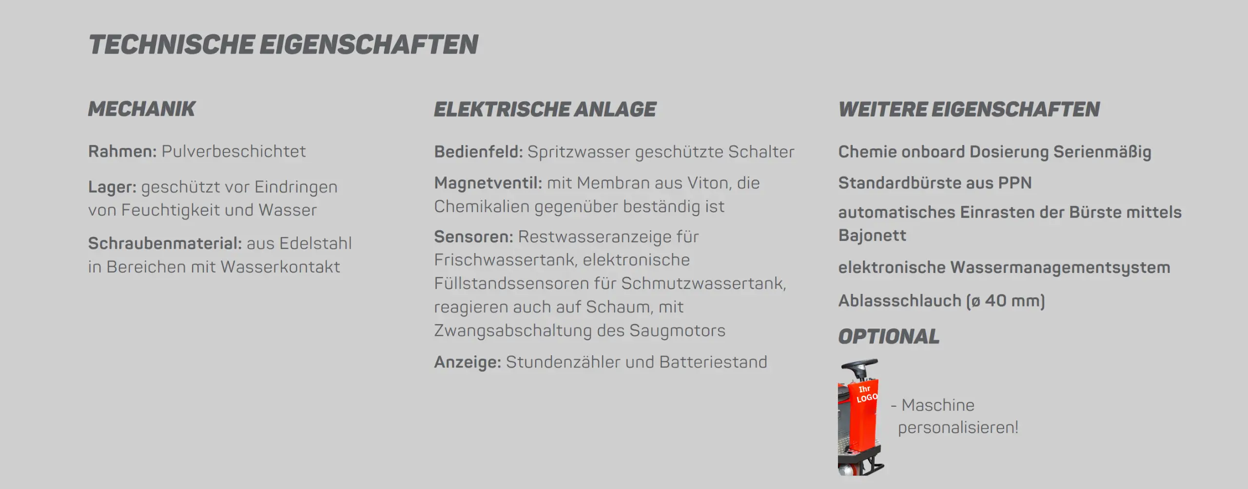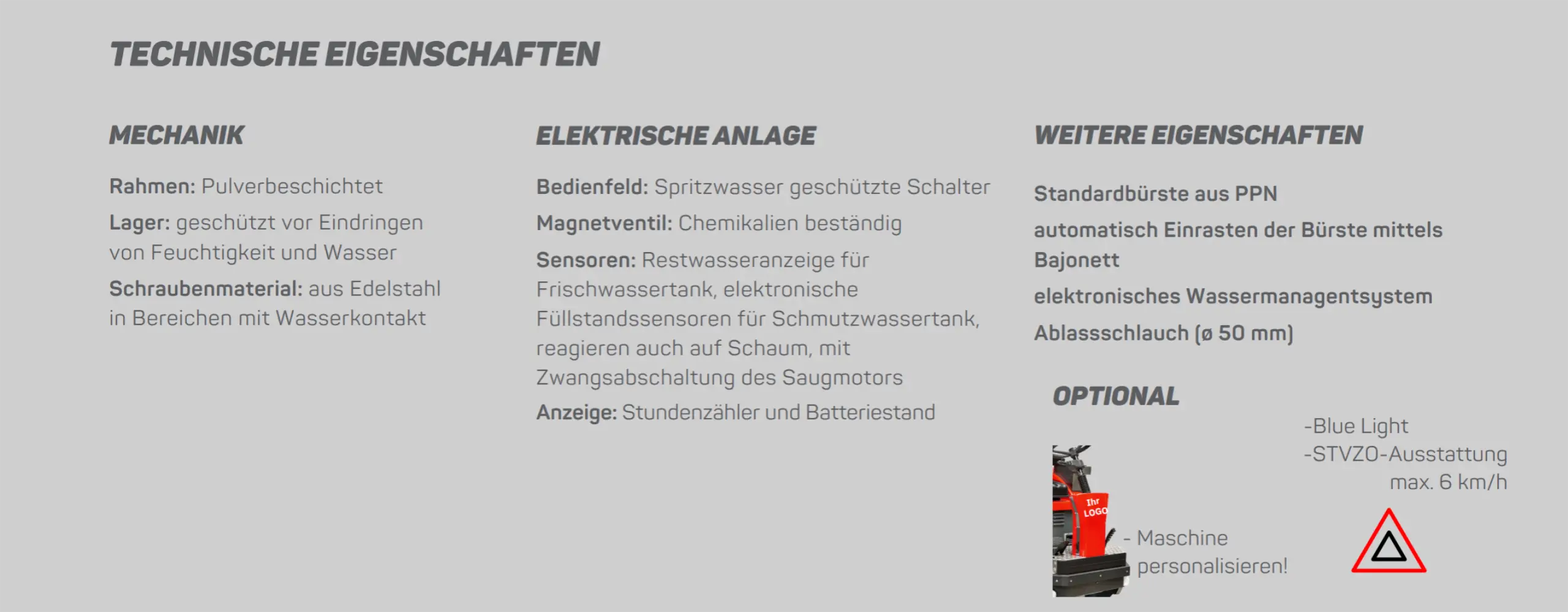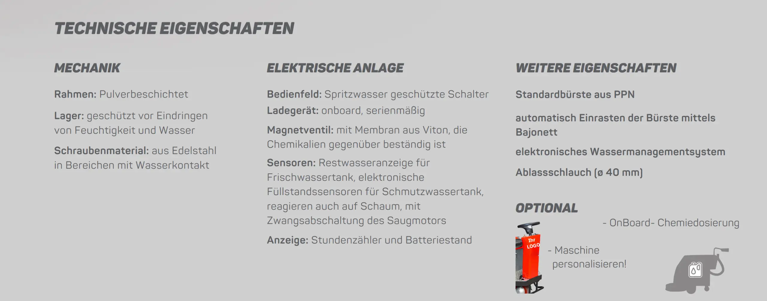 Die 3 Bürsten sorgen für effiziente Reinigung, da jeder Bürstenkopf und Motor einzeln pendelnd aufgehängt ist, um Anfahrtsschäden zu vermeiden.